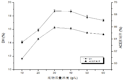 以核桃降壓肽的ACE抑制率和水解度為指標(biāo)分別考察雙酶復(fù)配配比、底物質(zhì)量濃度(g/L)、酶添加量(U/g)、三個因素對核桃降壓肽制備的影響,進(jìn)行單因素實(shí)驗(yàn)。