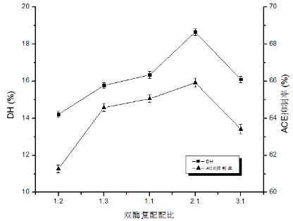 [10]以葵花籽為原料酶法制備ACE抑制肽報(bào)道的結(jié)果比較相似。綜合考慮選擇堿性蛋白酶和風(fēng)味蛋白酶為**適酶。