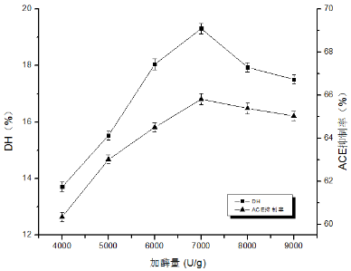 [11]。將水解溫度和pH調(diào)節(jié)**風(fēng)味蛋白酶的**佳條件(即溫度為50℃,pH6.5),用同樣的方法保持系統(tǒng)的pH不變,同時間隔一定時間記錄消耗的NaOH量。酶解結(jié)束后酶解液立即于90℃沸水中滅酶10min,8000r/min離心15min取上清液進(jìn)行水解度和ACE抑制率測定。