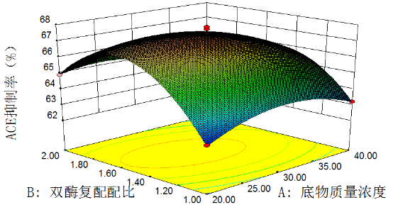 利用Design-Expert 8.0軟件進(jìn)行工藝參數(shù)的優(yōu)化組合,得到堿性蛋白酶-風(fēng)味蛋白酶分步酶解核桃蛋白制備ACE抑制肽的**佳工藝為:底物質(zhì)量濃度28.80g/L、加酶量6000U/g、雙酶復(fù)配配比3:2,ACE抑制率可達(dá)到67.7217%。根據(jù)實(shí)驗(yàn)室條件調(diào)整酶解工藝為底物質(zhì)量濃度29g/L、加酶量6000U/g、雙酶復(fù)配配比3:2,得到的實(shí)際抑制率67.05%。