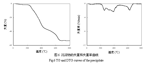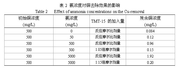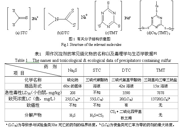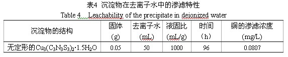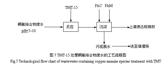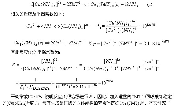 含銅廢水主要來(lái)自印刷電路板、金屬的漂洗和電鍍、紙漿制作等行業(yè)[1]。過(guò)量的銅會(huì)產(chǎn)生危害并有致突變作用[2],用含銅廢水灌溉農(nóng)田,銅可在土壤和農(nóng)作物內(nèi)累積,產(chǎn)生危害[3]。為了控制銅等重金屬對(duì)水體的污染,保護(hù)地面水和地下水水質(zhì)的良好狀態(tài),我G政府制定了統(tǒng)一的污水排放標(biāo)準(zhǔn),其中總銅的一級(jí)排放標(biāo)準(zhǔn)為0.5mg/L[4]。 當(dāng)廢水中含有絡(luò)合劑如NH3、EDTA、磷酸酯、檸檬酸鹽和天然有機(jī)酸時(shí),它們將與銅離子配位形成非常穩(wěn)定的可溶性絡(luò)合物,從而干擾傳統(tǒng)工藝對(duì)銅的處理[5]。以印制電路工業(yè)為例,目前印刷電路板的腐蝕多數(shù)采用堿氨蝕刻液。該蝕刻液借助氧化、溶解和配合等化學(xué)過(guò)程,將印制電路板上露出的銅以二氯化四氨合銅的形式溶解下來(lái),其總反應(yīng)為: ![]() 這樣,電路板經(jīng)堿性蝕刻后產(chǎn)生了大量的含銅清洗廢水和回收尾液。此類廢液偏堿性,NH3較多,銅以較穩(wěn)定的銅氨絡(luò)合物形式存在。采用混凝、中和沉淀、吸附、電解、微生物法等處理方法,難以達(dá)到良好的去除效果或處理成本太高。而采用硫化物沉淀法處理含絡(luò)合劑的重金屬?gòu)U水,由于各種重金屬硫化物的溶度積都非常小,重金屬的去除效果很好。常用的硫化物分無(wú)機(jī)硫(硫化鈉)與有機(jī)硫(STC、DTC和TMT)兩大類,有關(guān)分子結(jié)構(gòu)見圖1,它們的生態(tài)學(xué)及毒理學(xué)數(shù)據(jù)見表1。 ![]() 從表1中可以看出,與TMT相比,硫化鈉、STC和DTC的毒性較大,特別是DTC更具有生物殺傷性,曾經(jīng)由于它的過(guò)量投加,殺死了從Anderson 到 Indianapolis的50英米流域內(nèi)的117噸魚[7]。TMT常見的商品形式為15%的水溶液,俗稱TMT-15,它在20℃時(shí)的密度為1.12g/mL[6]。可見,當(dāng)每立方米廢水中含有高達(dá)12000mLTMT-15時(shí),仍不會(huì)對(duì)魚類的生存造成任何不良影響,因此,TMT是一種環(huán)境友好型有機(jī)硫藥劑。在含有[Cu(NH3)4]2+的廢水中加入TMT-15時(shí),發(fā)生以下反應(yīng): ![]() 用TMT-15處理含銅氨絡(luò)合離子廢水的影響因素,用元素分析、紅外與X衍射等手段表征了生成的沉淀,并對(duì)它的熱穩(wěn)定性與在去離子水中的滲濾特性作了初步探討。 1 試驗(yàn)部分 1.1 試劑 固體Na3(C3N3S3)•9H2O(即TMT)為美GAldrich公司出品,將33.32g 的Na3(C3N3S3)•9H2O 晶體溶解于100g 的去離子水中,即為TMT的15%水溶液,俗稱TMT-15。其余所涉及的化學(xué)品皆為分析純,實(shí)驗(yàn)所用的水都為新鮮的去離子水,其電導(dǎo)率小于0.7μs/cm。 1.2 主要儀器 實(shí)驗(yàn)中pH值的測(cè)定是由Hanna pH 211型ph計(jì)與E-201-C-6型復(fù)合電極完成的,采用的pH定位液(4.01、6.86 和9.18)由上海雷磁公司出品。熱重分析采用Setaram Setsys-16 TA儀,實(shí)驗(yàn)在99.999%的氮?dú)夥諊羞M(jìn)行,氣體流速為50mL/min,溫度范圍為20-800℃,程序升溫速率為10℃/min。紅外分析采用KBr壓片法在Nicolet-Nexus 670紅外光譜分析儀上進(jìn)行。采用日本理學(xué)D/max—rA型衍射儀進(jìn)行物質(zhì)的晶相結(jié)構(gòu)分析,以Cu靶的Kα1 (λ= 1.540598 Å)為輻射源,工作電壓40kV,掃描范圍為2θ=10°~90°,掃描速度為8°/min。C、H、N、S的分析在Flash EA 1112 Series型元素分析儀上進(jìn)行。銅濃度的測(cè)定在Iris Interpid Ⅱ XSP型電感耦合等離子發(fā)射光譜儀(ICP-AES)上進(jìn)行。 1.3 試驗(yàn)方法 1.3.1 殘余銅濃度的測(cè)定 在研究影響銅去除效果因素的試驗(yàn)中,我們配制了含不同銅和氨濃度的溶液各100mL,分別加入一定量的TMT-15藥劑,絮凝劑(聚合氯化鋁PAC)和助凝劑(聚丙烯酰胺PAM)后,靜置一定時(shí)間,取上清液用ICP-AES儀測(cè)定其殘余的銅濃度。 1.3.2 沉淀產(chǎn)物的制備 為了較好地研究TMT螯合沉淀法所生成的沉淀,我們結(jié)合現(xiàn)場(chǎng)的實(shí)際,按下述實(shí)驗(yàn)條件制備了研究所用的沉淀物。我們配制溶液的銅初始濃度為500 mg/L,氨濃度為500 mg/L,按反應(yīng)(1)的物質(zhì)摩爾比(TMT與Cu的摩爾比為2:3)加入一定量的TMT-15后,立即生成紅棕色沉淀,不加入任何絮凝劑與助凝劑,攪拌30分鐘后,將此沉淀過(guò)濾,用水和乙醇沖洗數(shù)遍后,先在室溫下干燥,然后放入烘箱在130°C下干燥6h,即得到我們的研究對(duì)象。 1.3.3 沉淀產(chǎn)物的滲濾性實(shí)驗(yàn) 用Mettler Toledo AB204-E型的電子天平準(zhǔn)確稱取干燥后的沉淀產(chǎn)物0.05 g,放入已裝有50mL去離子水的容量瓶中,室溫條件下在往復(fù)式水平振蕩機(jī)上連續(xù)振蕩96h,振蕩頻率為110±10次/min,振幅為40mm,靜置后用0.45μm.的濾膜過(guò)濾,用ICP-AES儀測(cè)濾液中銅濃度。 2 結(jié)果與討論 2.1 影響銅去除效果的因素研究 2.1.1 氨濃度對(duì)銅去除效果的影響 我們用CuCl2和氨水配制了四種氨濃度不同的溶液各100mL,其中銅離子濃度均為500mg/L,而NH3的濃度分別為0、50、500和5000mg/L。然后按化學(xué)反應(yīng)摩爾比的劑量(TMT與Cu的反應(yīng)摩爾比為2:3)加入TMT-15,靜置30min后,取上層清液測(cè)定剩余銅濃度,結(jié)果見表2。從表2中可以看出,在銅的初始濃度與TMT-15的加入量都相同的條件下,溶液中絡(luò)合劑氨的濃度越高,處理后的殘余銅濃度也越高,銅的去除率下降。對(duì)于這種氨濃度較高的銅氨溶液,為了使其