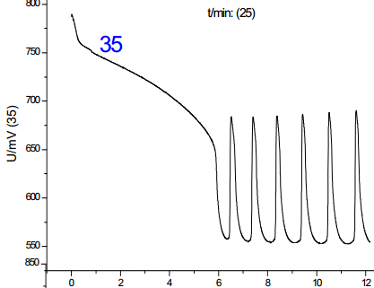 (3) 觀察分析圖形可知:反應(yīng)物的濃度不但影響了誘導(dǎo)時(shí)間和振蕩周期,同時(shí)還影響了振蕩的波形。濃度對(duì)振蕩體系的影響是比較顯著的;但濃度對(duì)振幅的影響卻不大,說(shuō)明濃度對(duì)振蕩體系的各個(gè)參數(shù)的影響是有選擇性的。這也反映出化學(xué)振蕩體系本身的復(fù)雜性,及其極容易受反應(yīng)環(huán)境的影響。