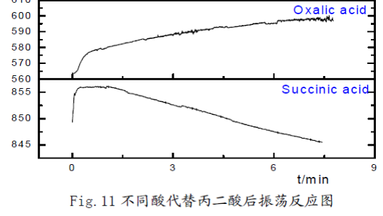 用0.45M丁二酸、0.45M乙二酸、0.45M檸檬酸代替丙二酸,用0.20M碘酸鉀、溴酸鈉代替溴酸鉀,用硫酸錳、硫酸鐵溶液代替硫酸鈰銨,分別進(jìn)行實(shí)驗(yàn),觀察是否發(fā)生振蕩
