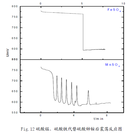 3) 用硫酸錳代替硫酸鈰銨后,可以看到振蕩現(xiàn)象,但是用硫酸鐵代替硫酸鈰銨,振蕩反應(yīng)沒有發(fā)生,但是查閱資料知:Mn2+、Fe3+同樣具有催化作用。在振蕩體系中,錳元素存在Mn2+、Mn3+兩種形式,鐵元素以Fe2+、Fe3+的形式存在。