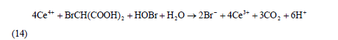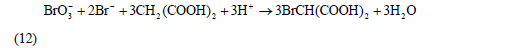 此時(shí),濃度較大的Br2與丙二酸反應(yīng)生成BrCH(COOH)2,即反應(yīng)(8)。反應(yīng)(8)與反應(yīng)(11)構(gòu)成了Br-與Br2的循環(huán),其總體的宏觀效果(簡(jiǎn)稱過程A)可表示為: