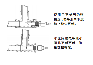 為確保電導(dǎo)池測(cè)量結(jié)果準(zhǔn)確,應(yīng)避免電導(dǎo)池間因有氣泡或死水而造成數(shù)據(jù)失準(zhǔn),請(qǐng)嚴(yán)格按下圖正確安裝方式安裝: