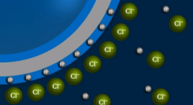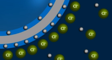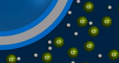 當(dāng)探針浸入溶液中時(shí),較小的氫離子能夠穿透玻璃膜的邊界區(qū)域,較大的氯離子保留在溶液本身中。因此,結(jié)果是電荷分離,如下圖所示: